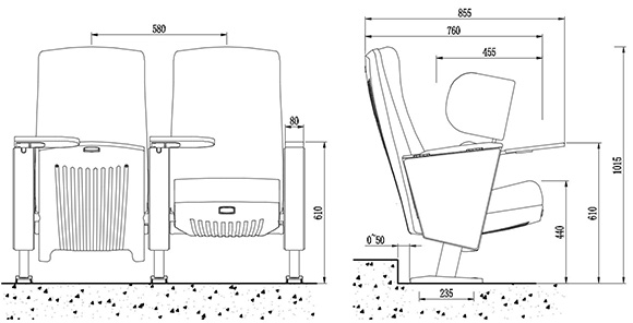 2.座椅基本中心距為580±5mm,座包打開側(cè)深760±5mm,寫字板打開側(cè)深855±5mm,基本椅高為1015±5mm,最小排距:900mm。